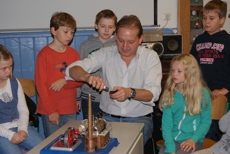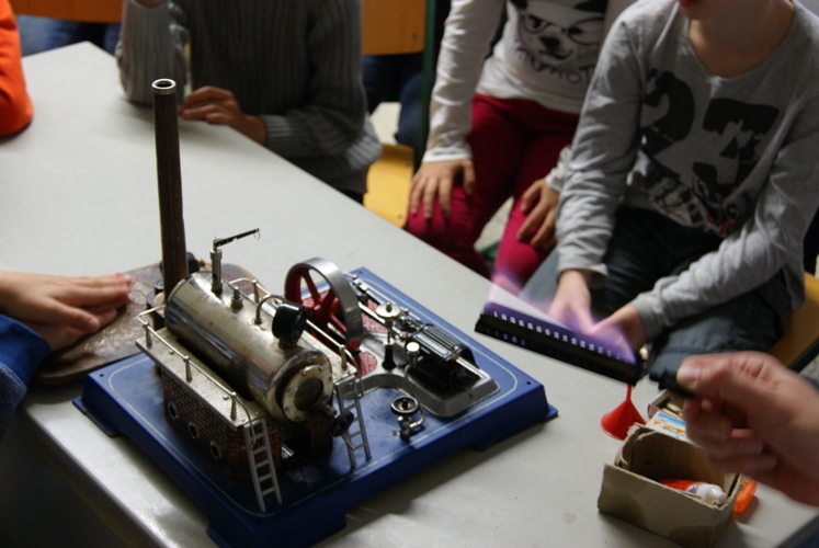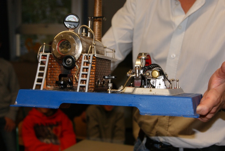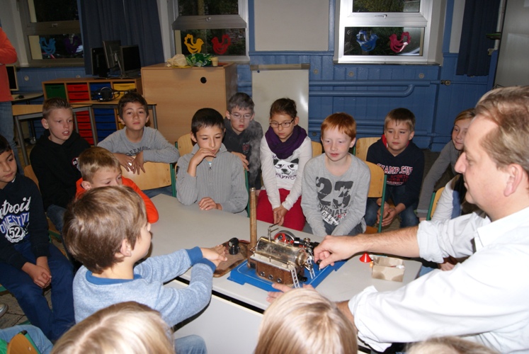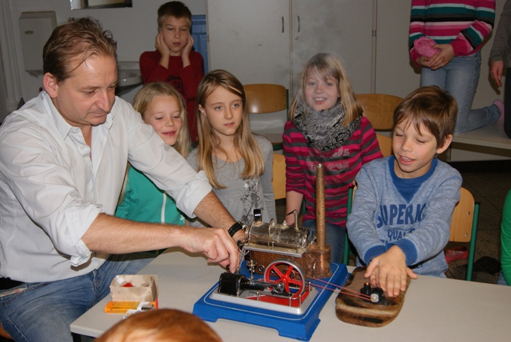 Gespannt verfolgen die Schüler die Funktionsweise eines Kraftwerks, demonstriert an einer kleinen Dampfmaschine