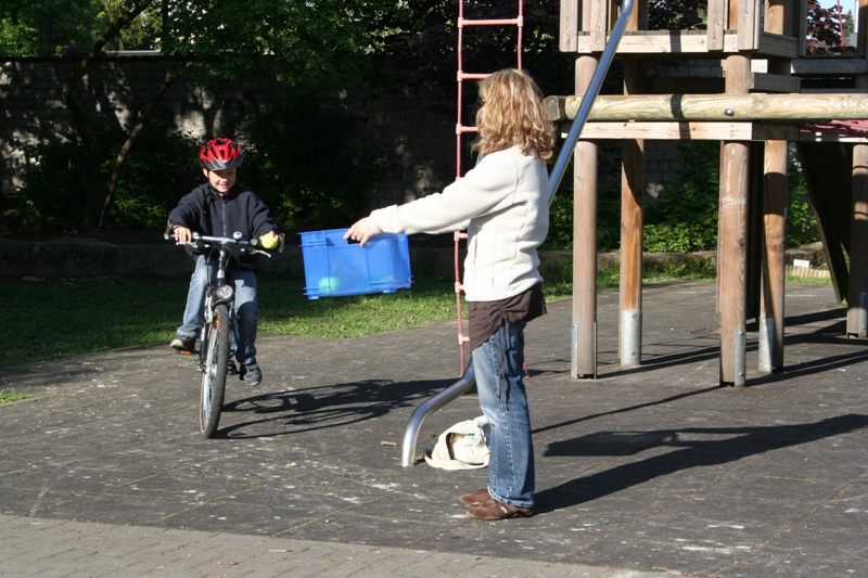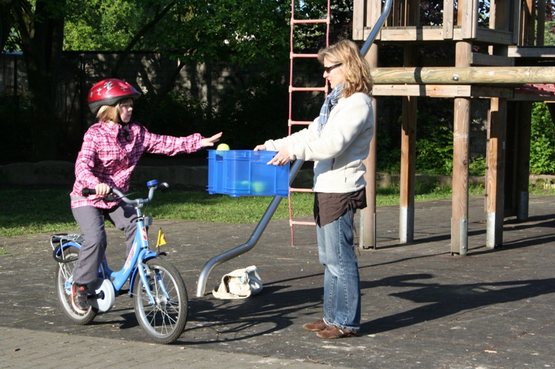 - mit einer Hand am Lenker fahren und einen Ball während der Fahrt in die Kiste werfen