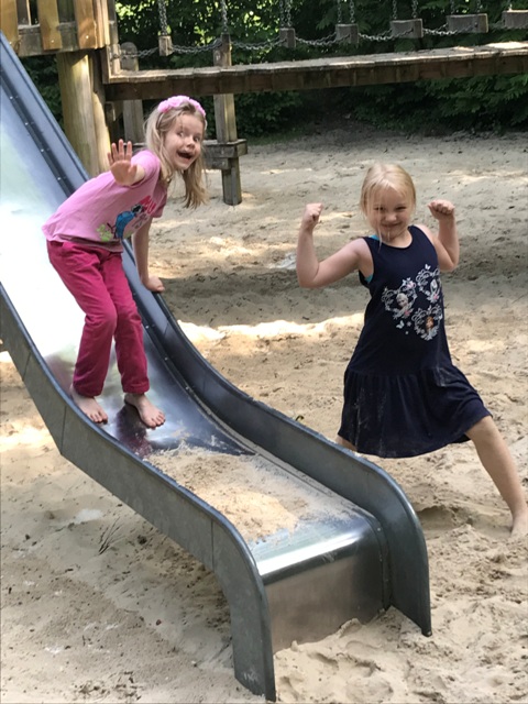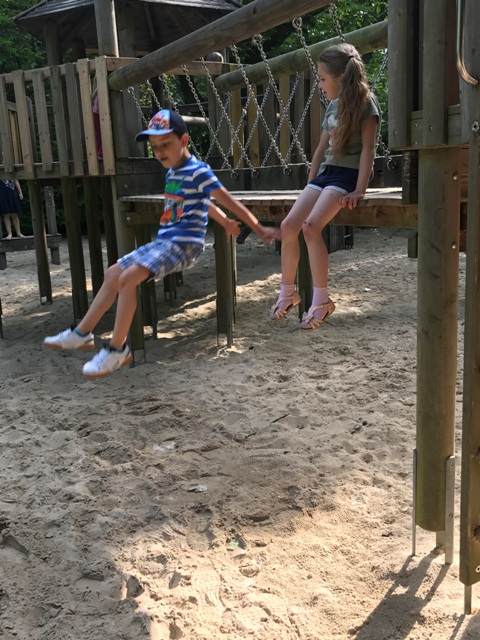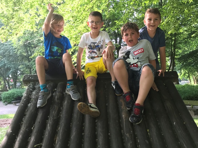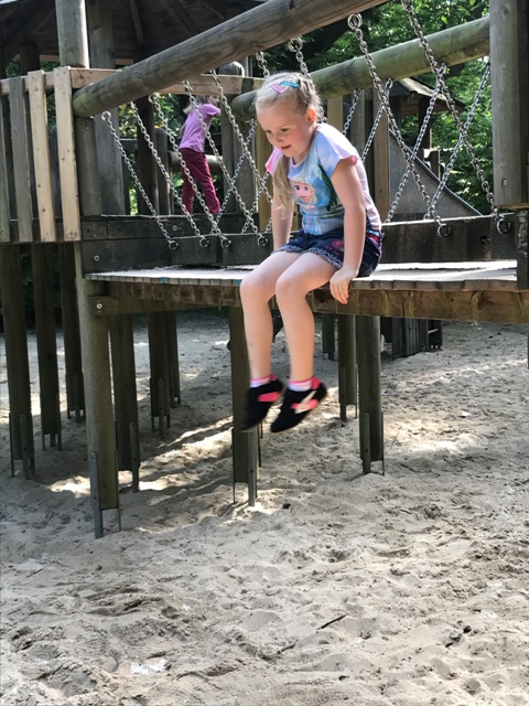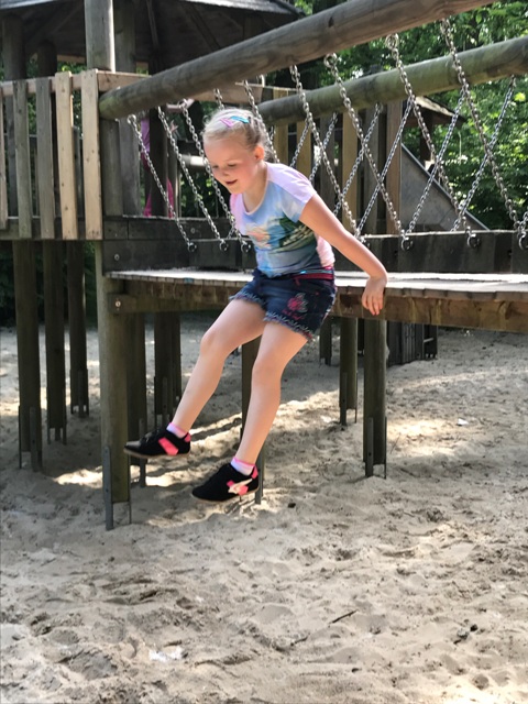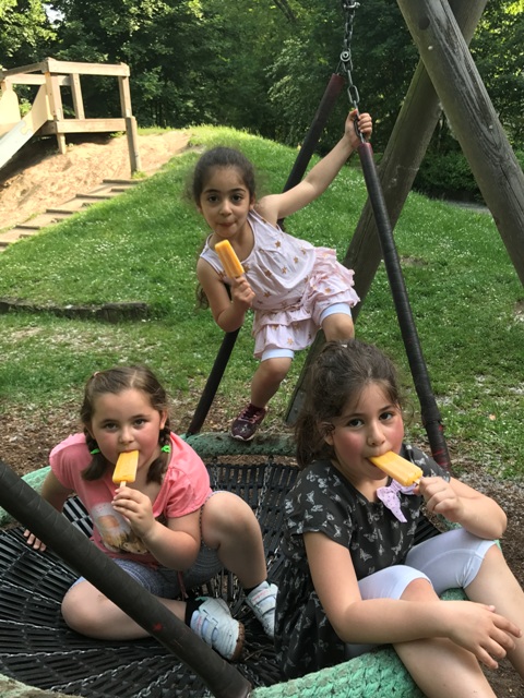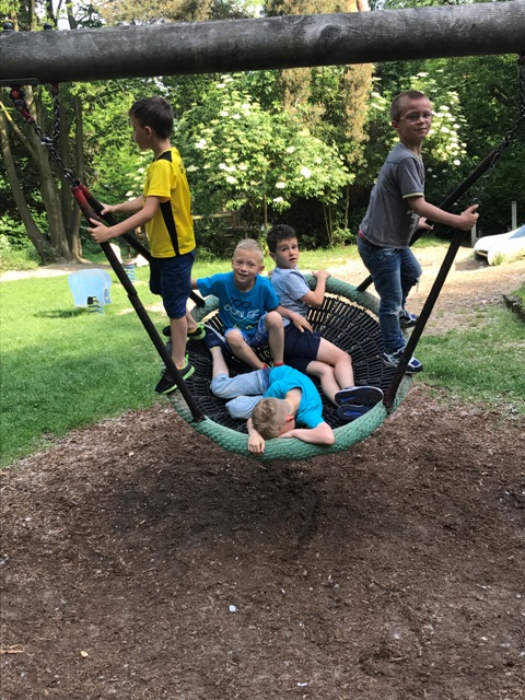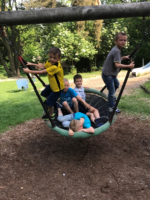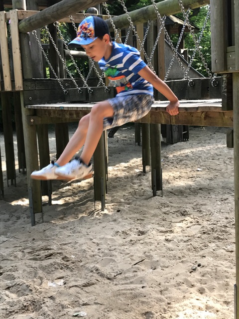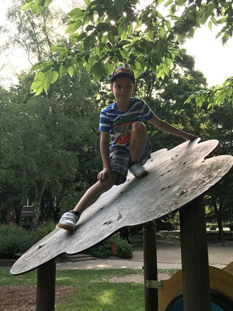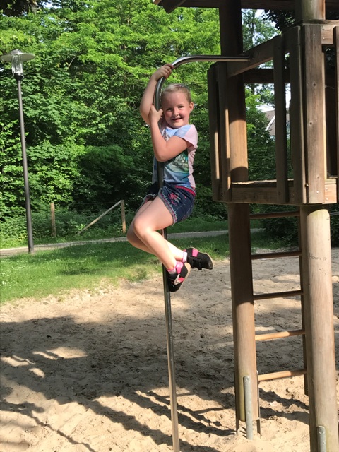 Weil es heute so heiß war, haben wir ein bisschen Sport im Schatten der Bäume auf dem Spielplatz gemacht.