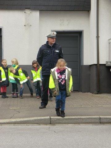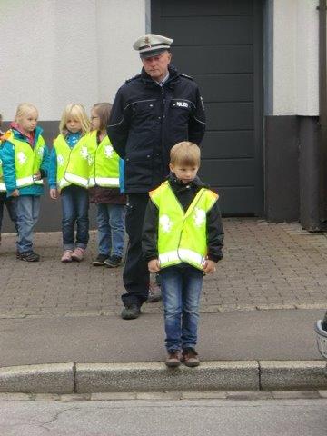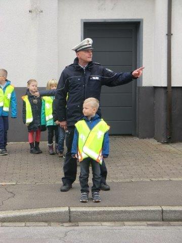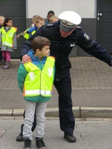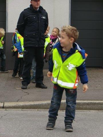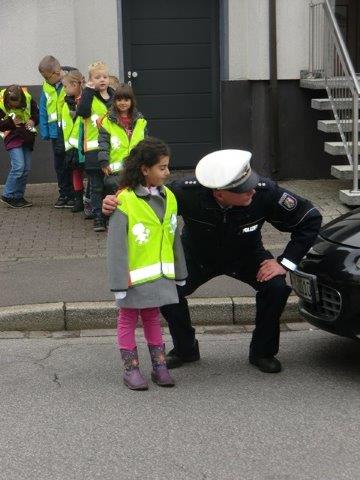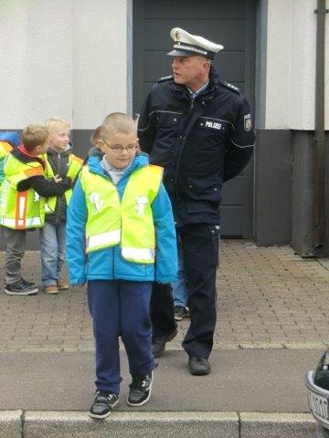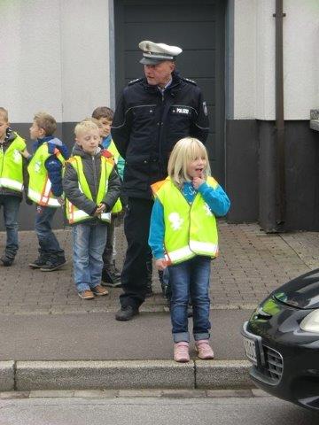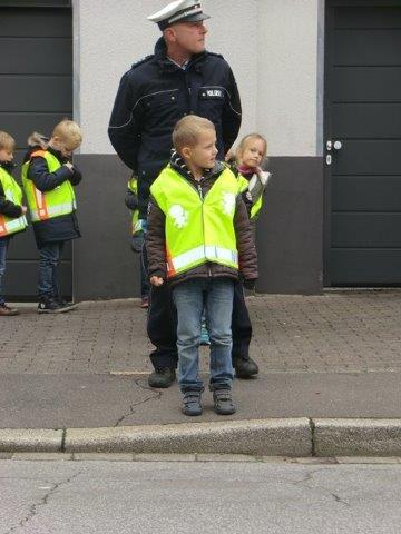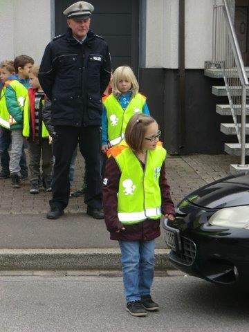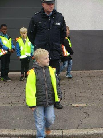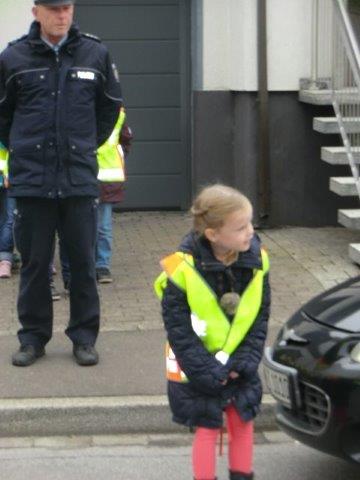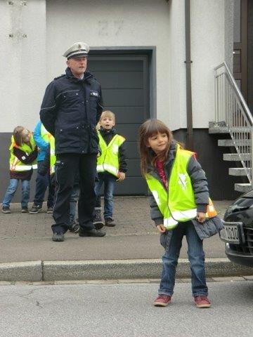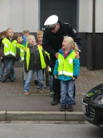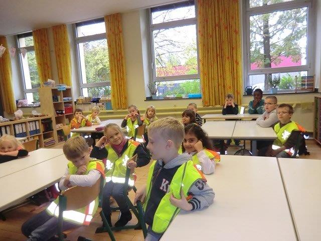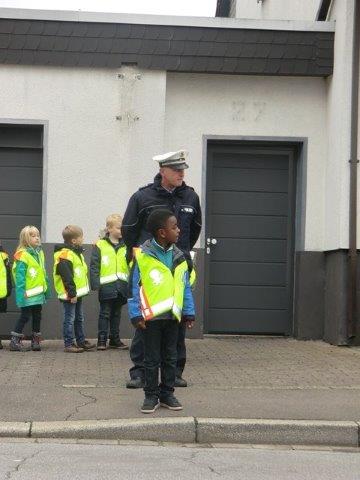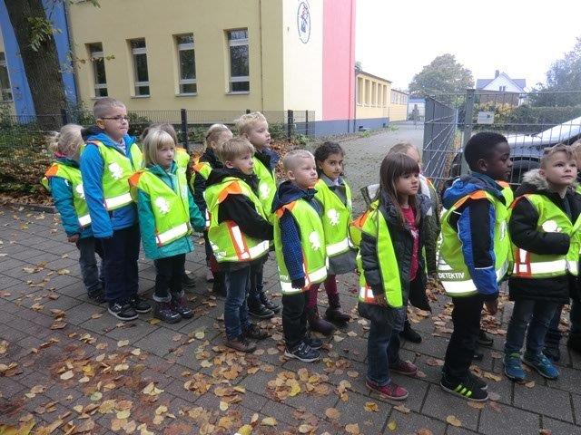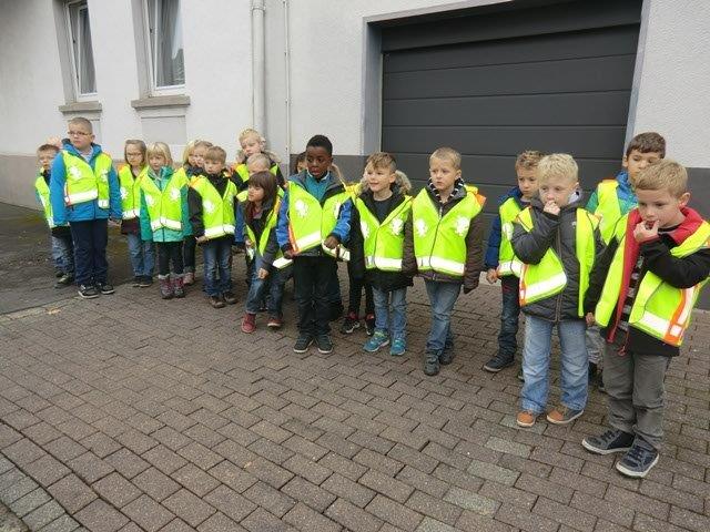 Herr Happel lässt uns stramm stehen und wie eine Giraffe sehen ;-) Heute haben wir unsere Sicherheitswesten bekommen, damit wir zur dunklen Jahreszeit für alle gut sichtbar sind. Gleichzeitig hat uns Herr Happel an den Giraffenblick erinnert, mit dem wir sicher über die Straße kommen. Trotz der Gefahrenquelle "parkendes Auto" haben heute alle Kinder die Straße sicher überquert.