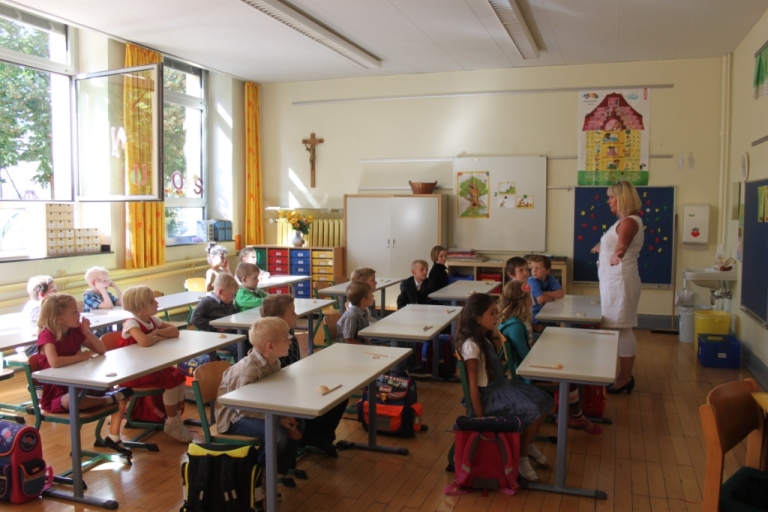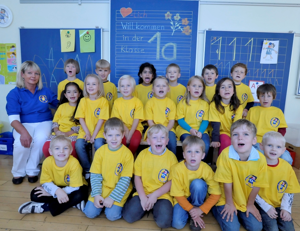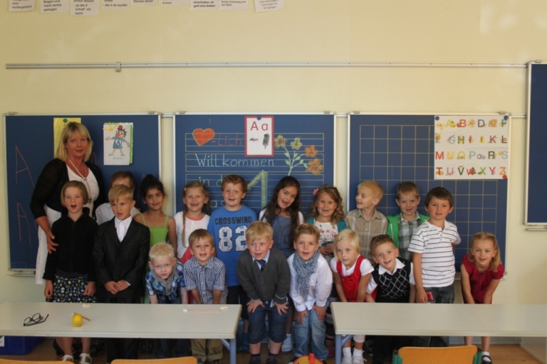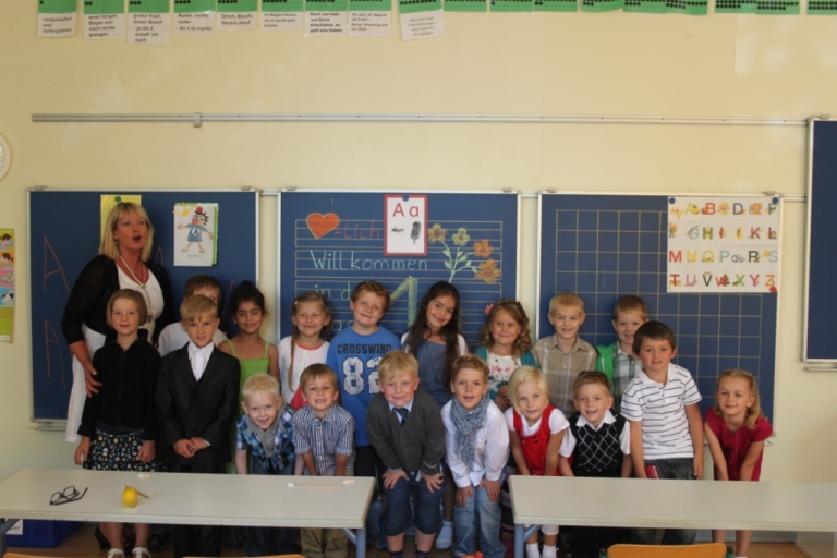 Hier seht ihr uns an unserem 1. Schultag in unserem schönen Klassenraum.