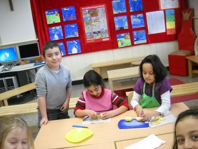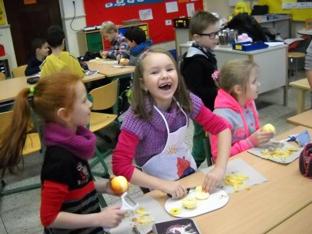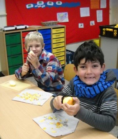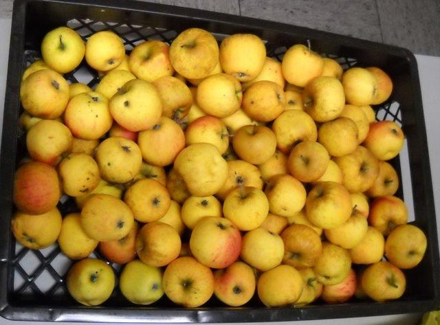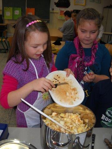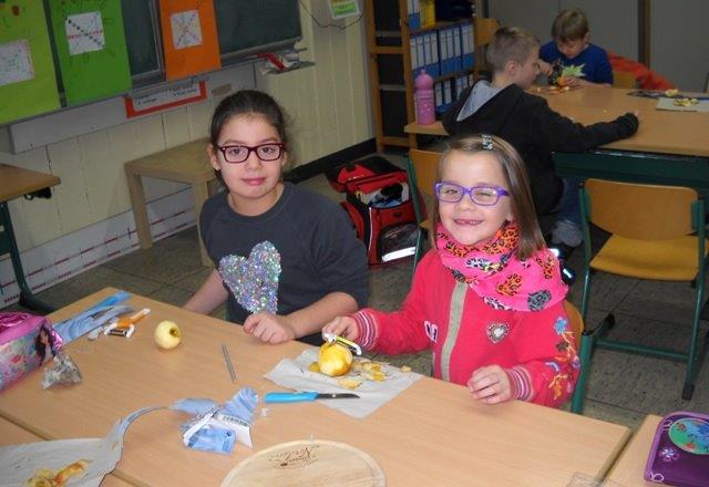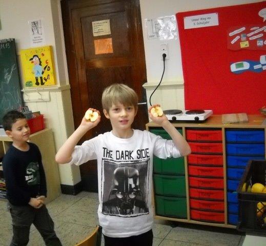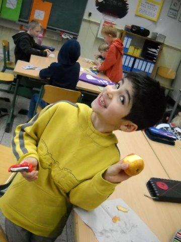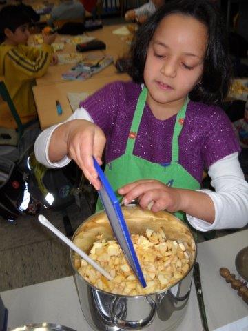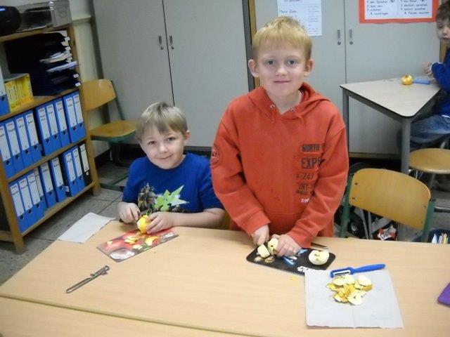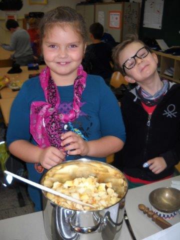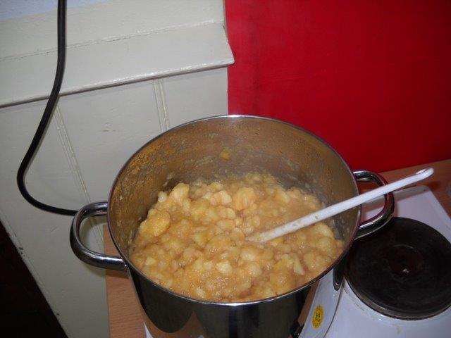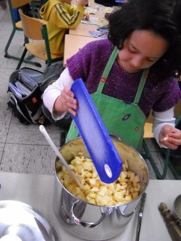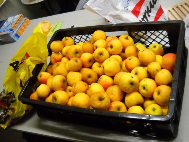Heute hat Frau Spieker Äpfel aus ihrem Garten mitgebracht. Wir haben sie geschält, klein geschnitten und Apfelmus gekocht.