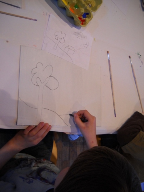 Mit den Skizzen (Elemente aus unterschiedlichen Bildern) haben wir dann unsere eigenen Landschaften gemalt.
