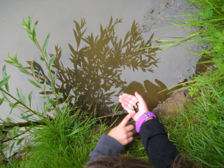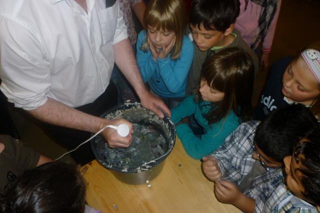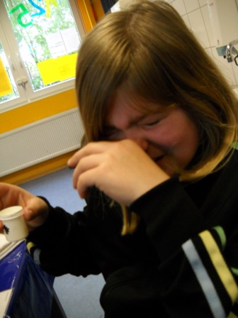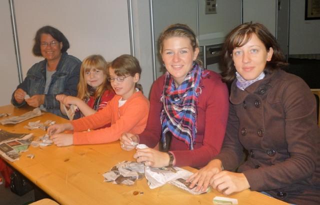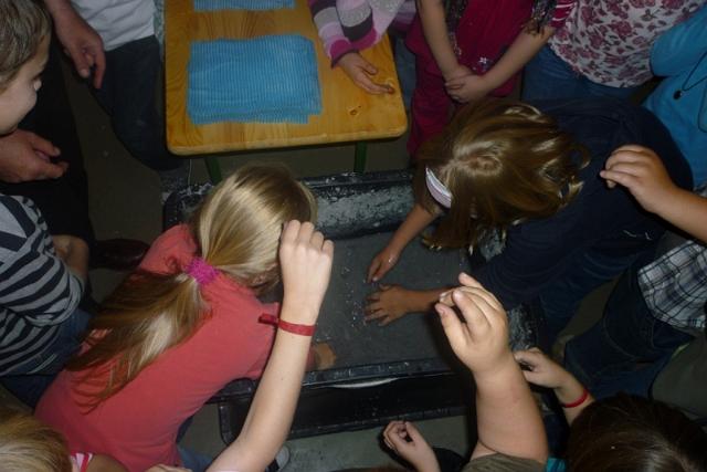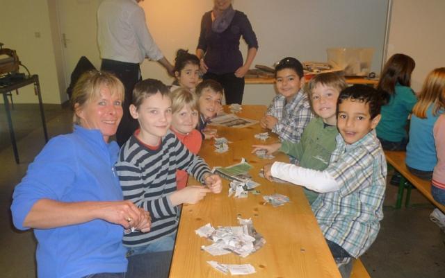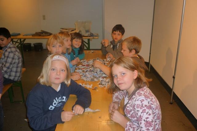 Dann haben wir selber Papier hergestellt. Wir mussten Zeitungspapier zerreißen und die Schnipsel in Wasser einweichen lassen.