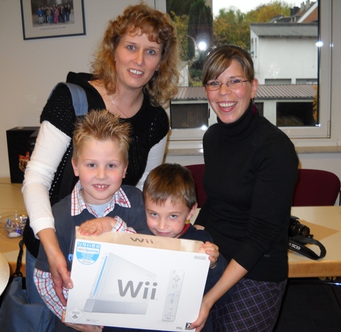 Frau Mühlbauer (Künstlerin aus Holzwickede), Frau Böhm und Herr Moßmeier (Sparkasse Unna) überreichen die Wii.