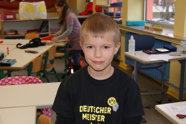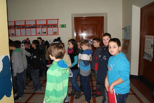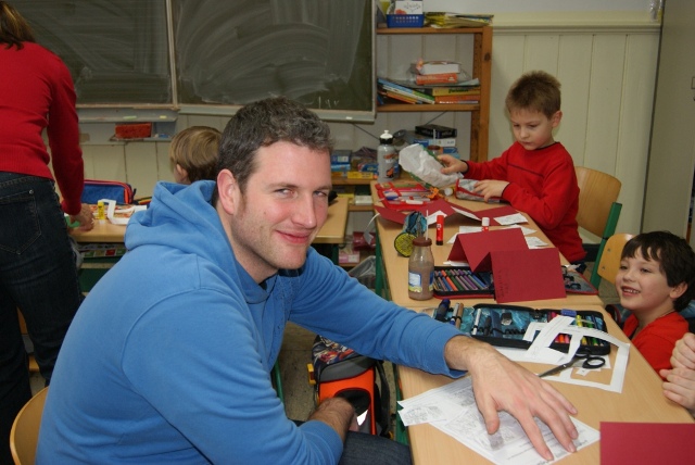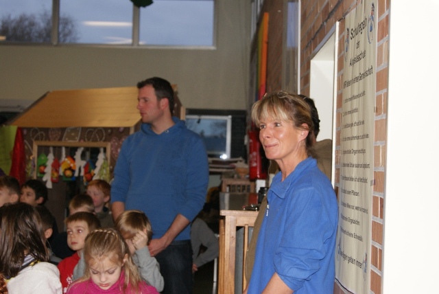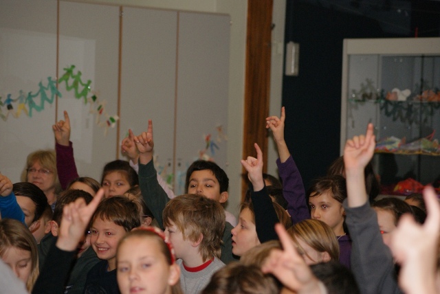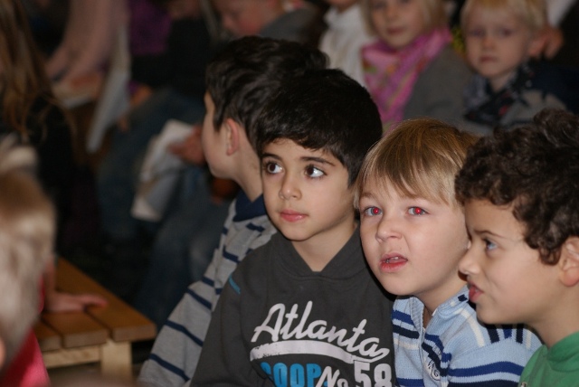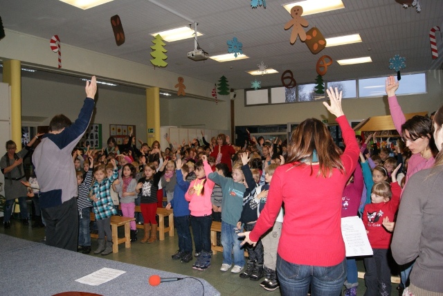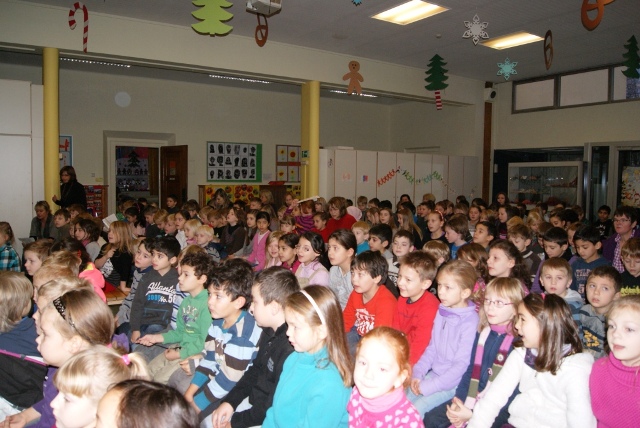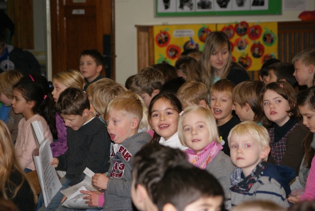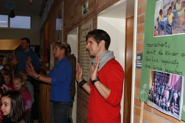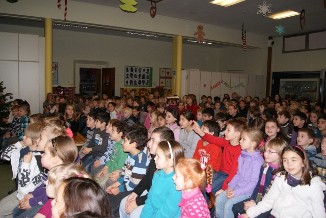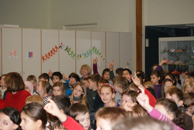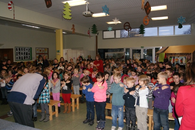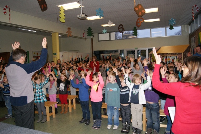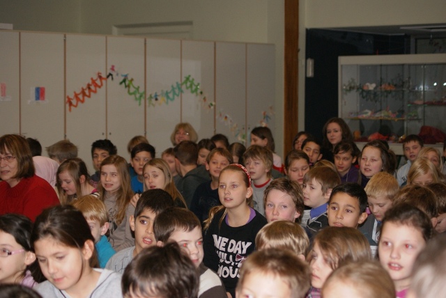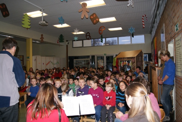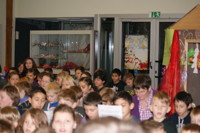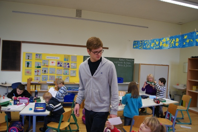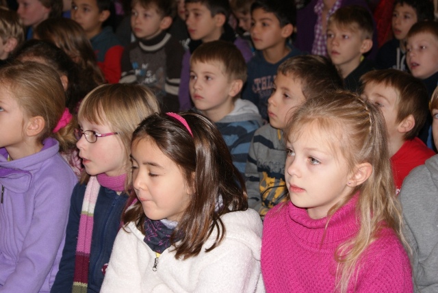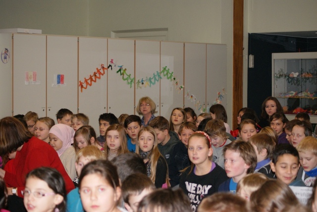 Gemeinsamer Anfang in der Pausenhalle mit Pfarrer Middelanis als Gast