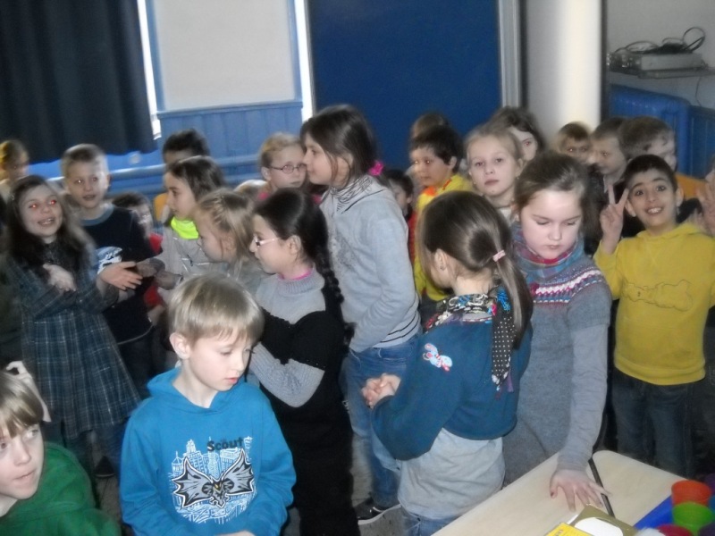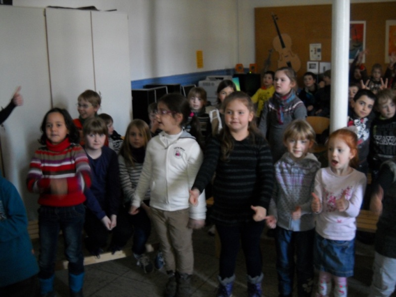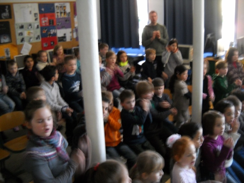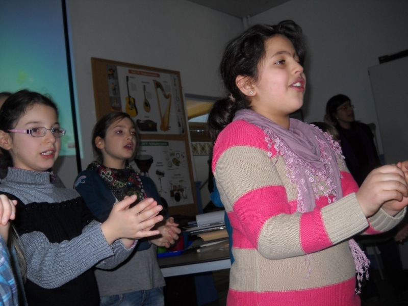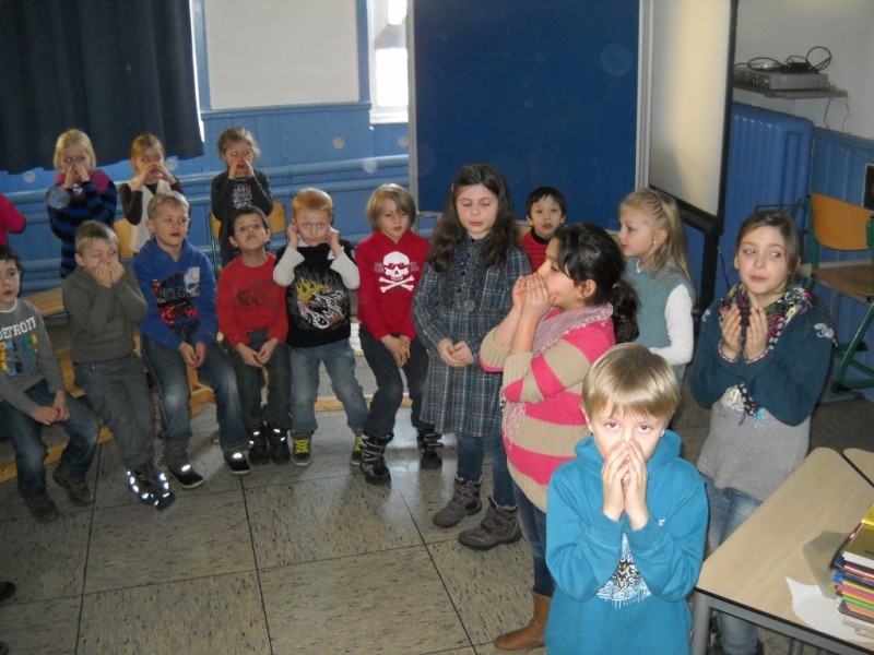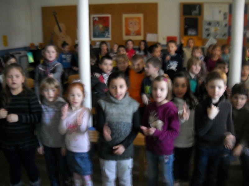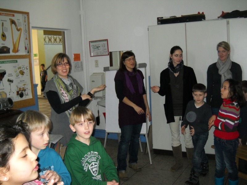Hier seht ihr uns, die Klassen 1b, 2a und 2b bei einer gemeinsamen Probe im Medienraum.