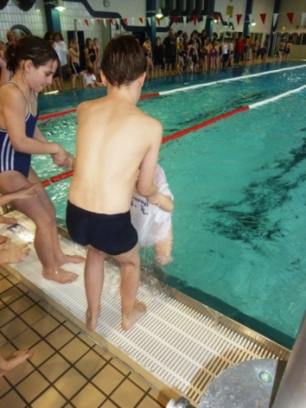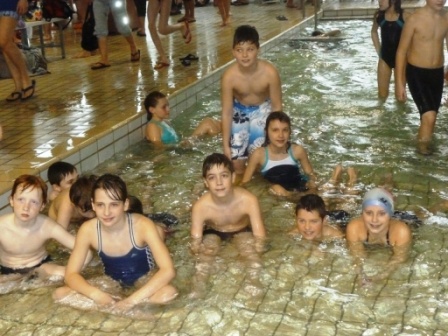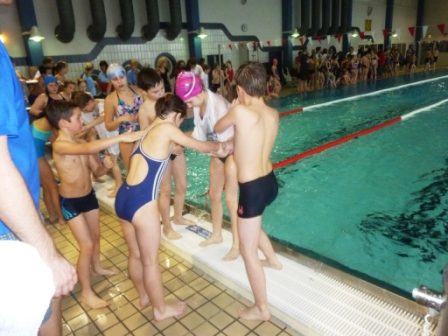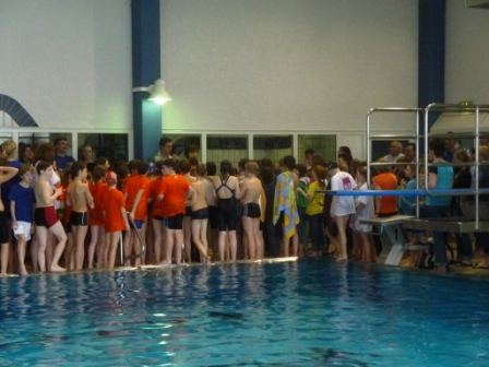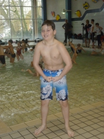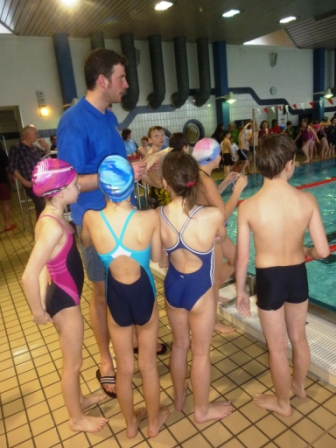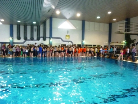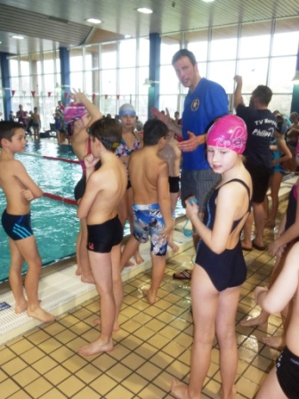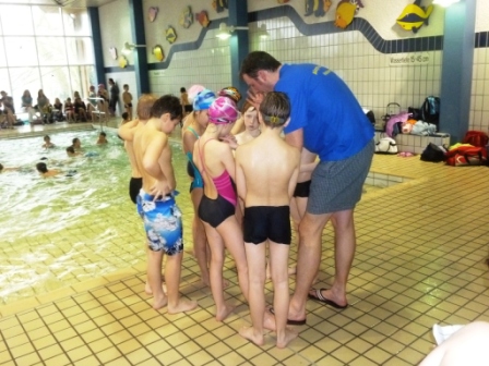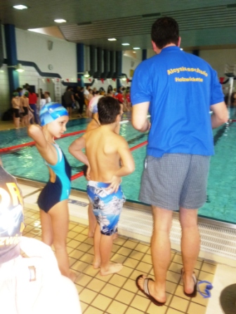 Hier seht ihr den Trainer und die Kinder, die so toll für unsere Schule geschwommen sind.