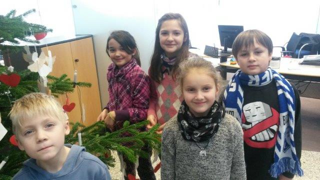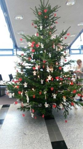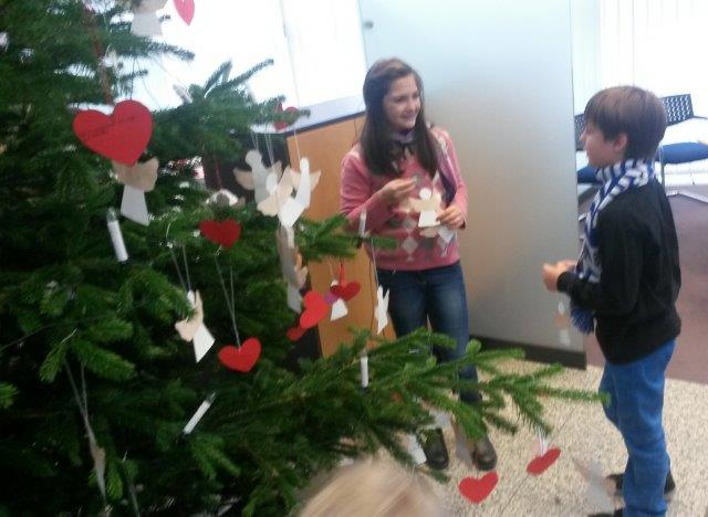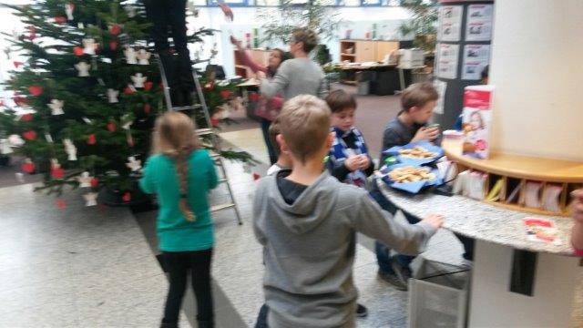um den Weihnachtsbaum mit dem von der ganzen Schule gebastelten Schmuck
