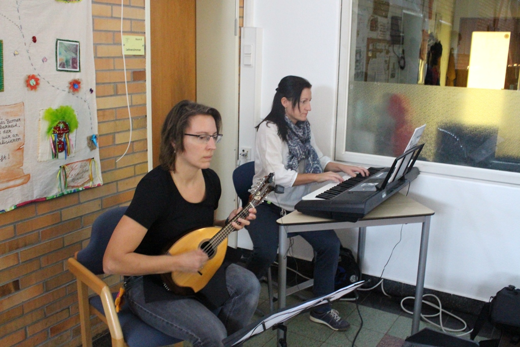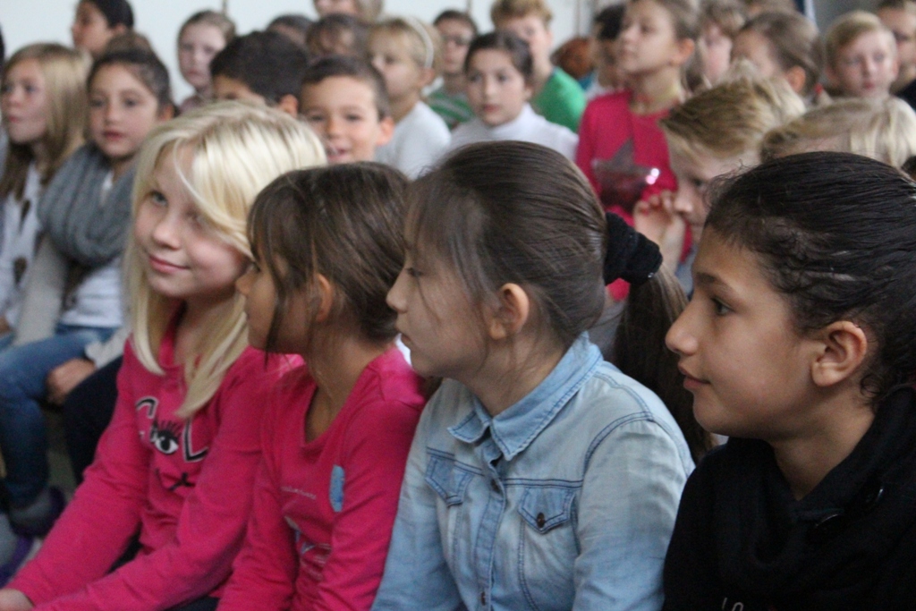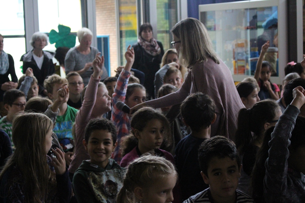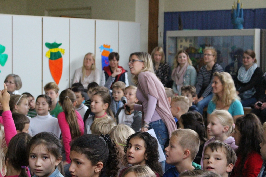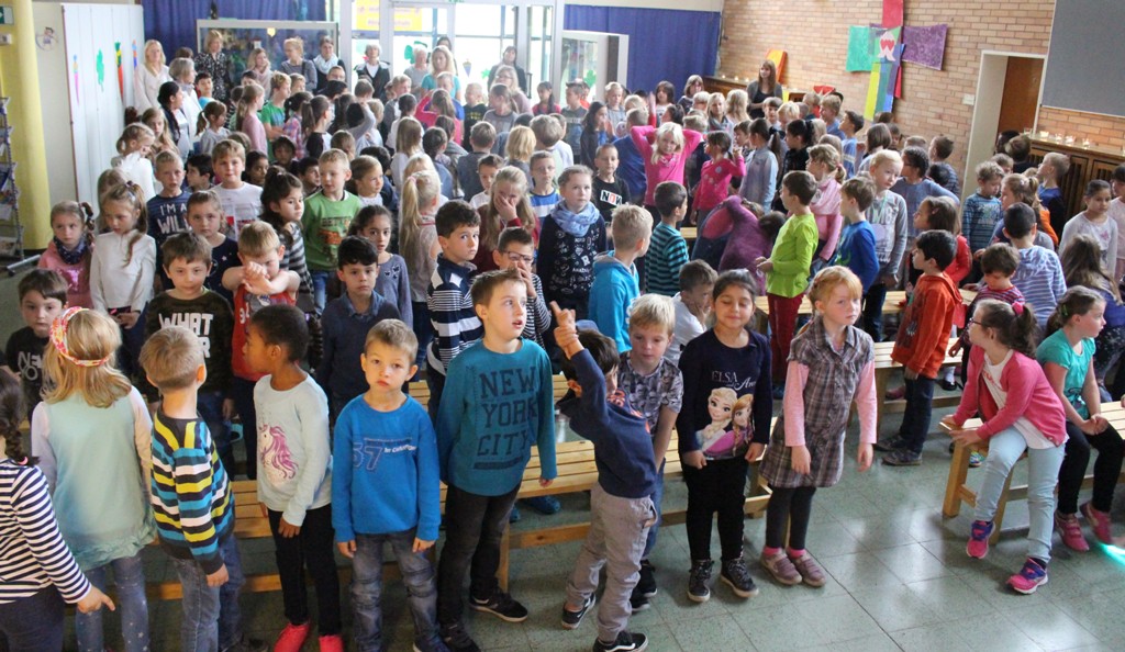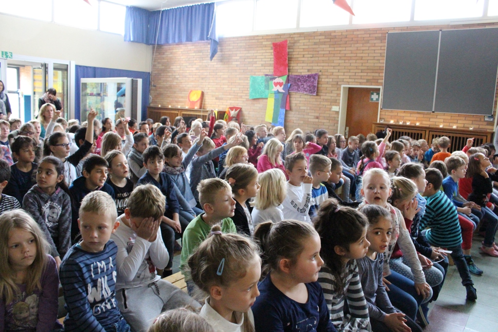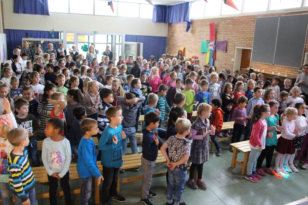 und Lehrer der schönen Aloysiusschule in der Pausenhalle zu einem