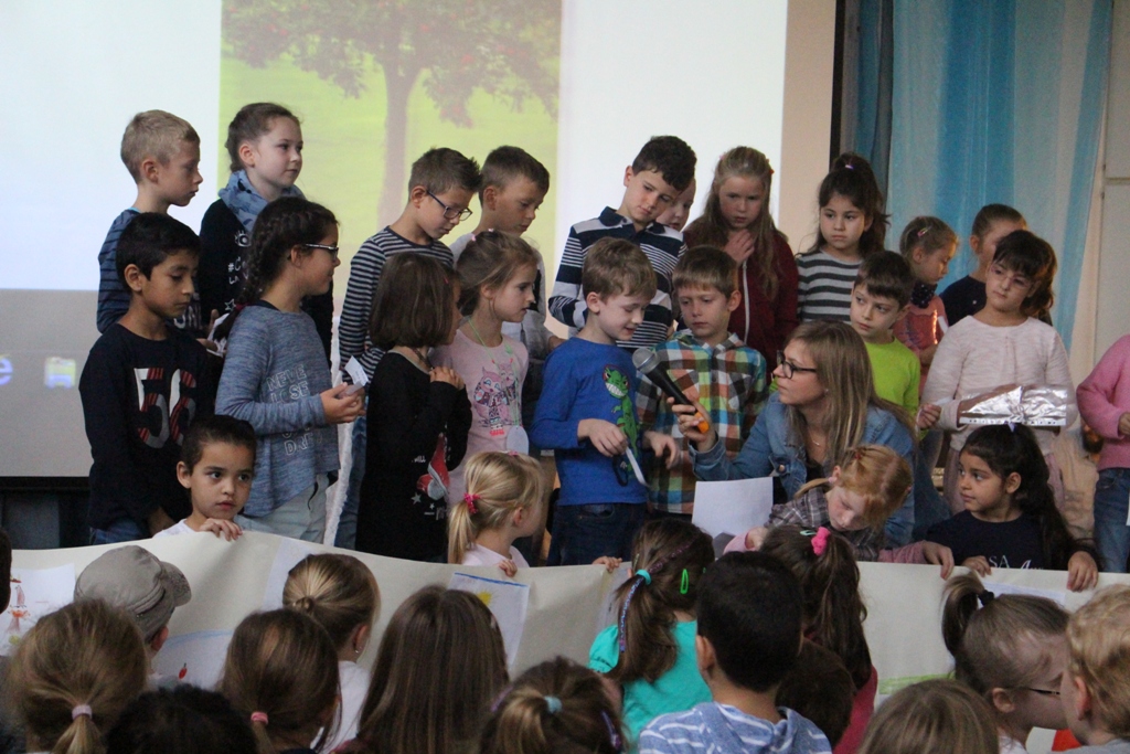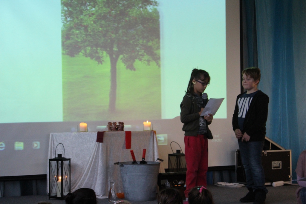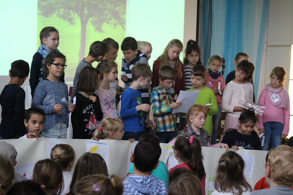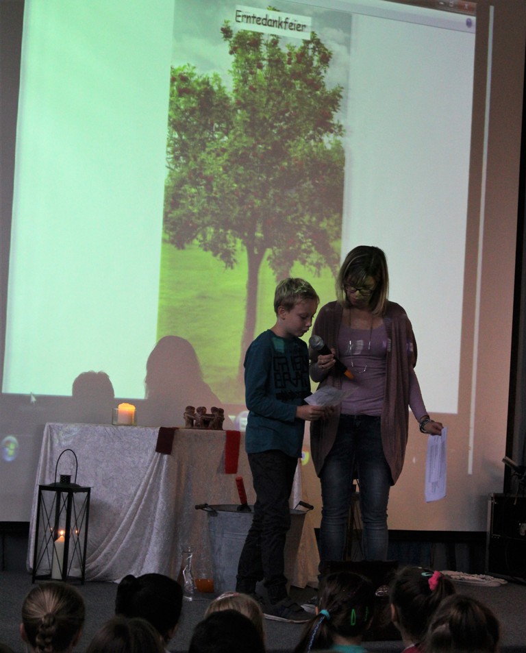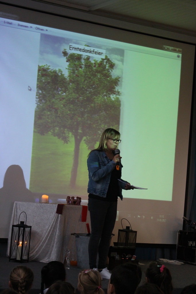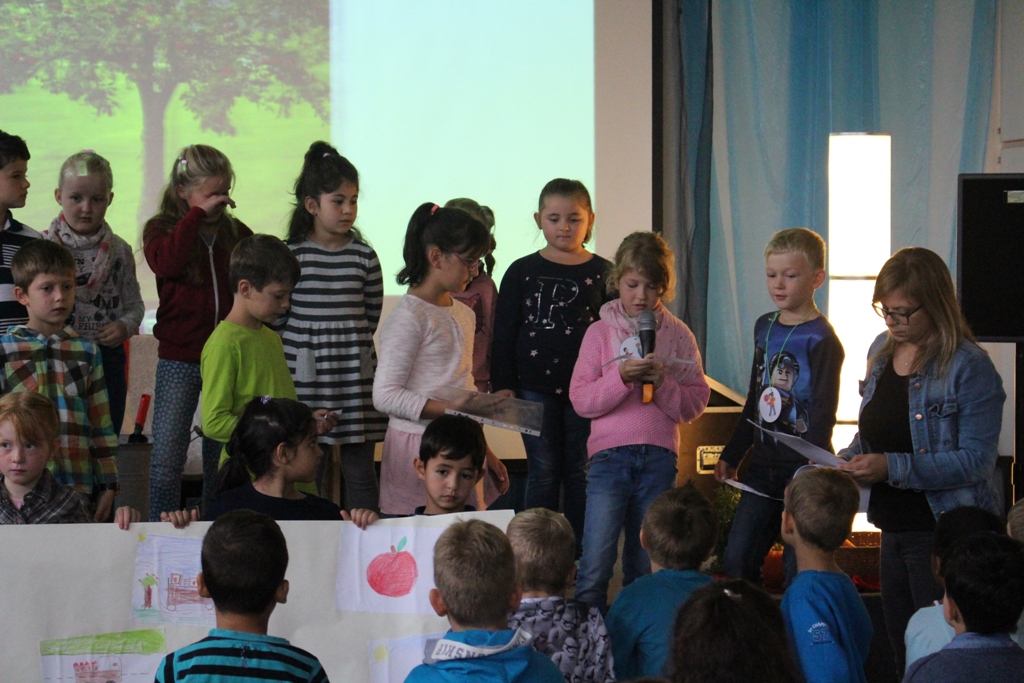 der Erntedankfeier, indem sie die Apfelweltreise schilderten, Bilder