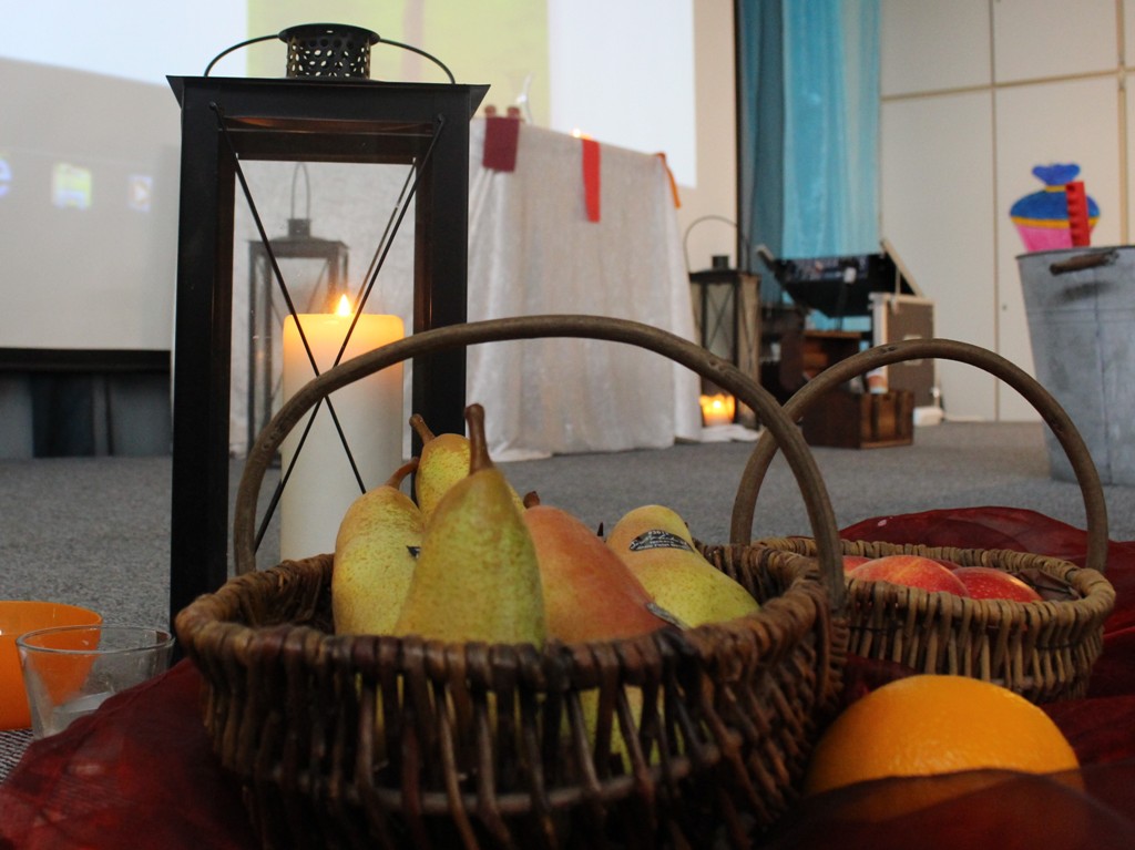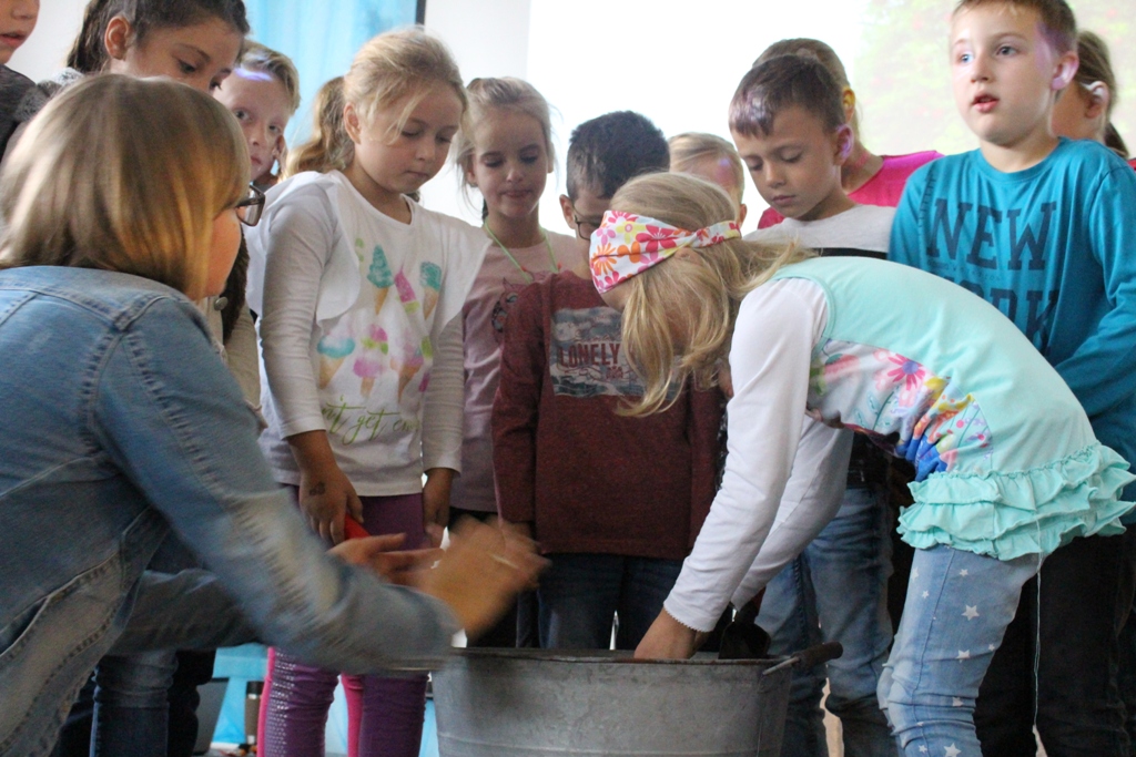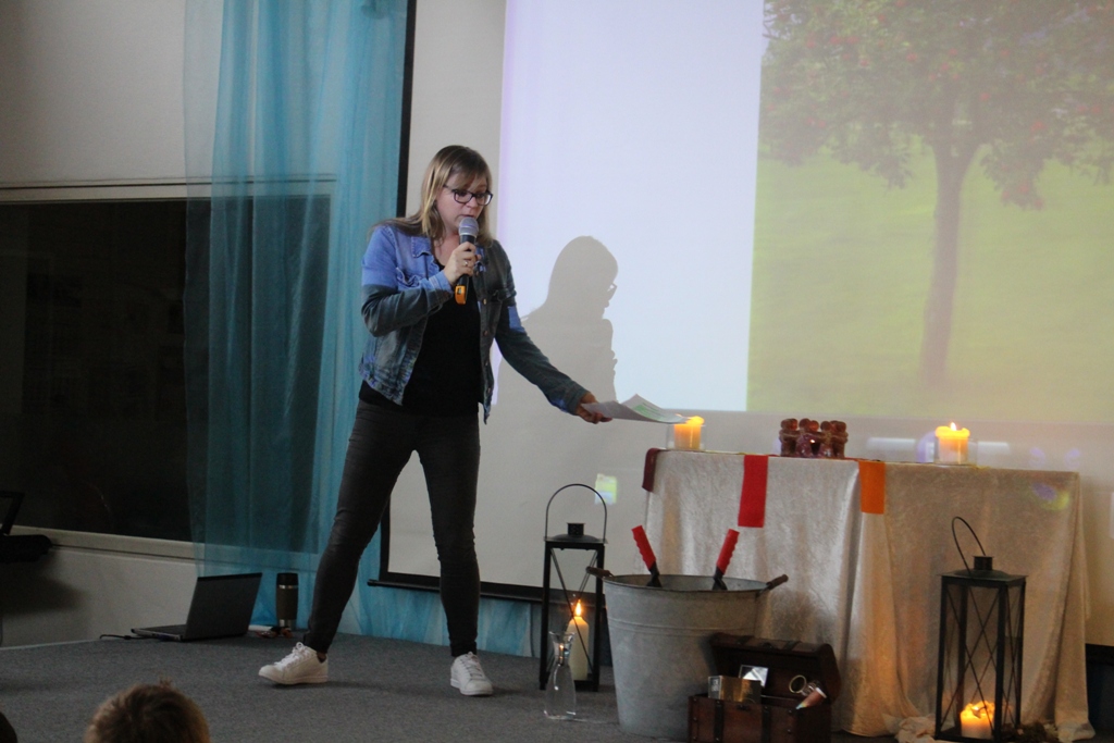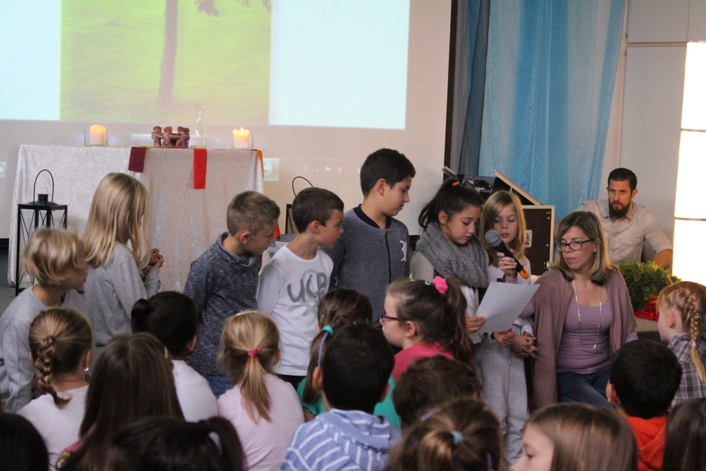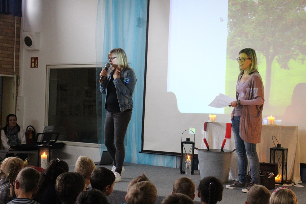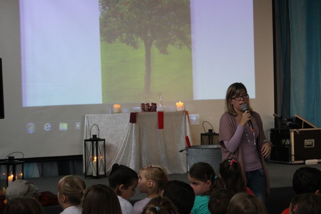 der Erntedankfeier, indem sie die Apfelweltreise schilderten, Bilder