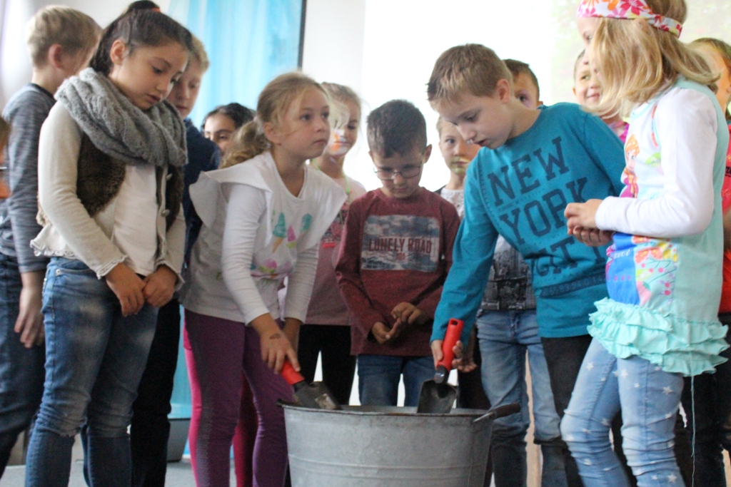 Einpflanzen von Apfelkernen seitens der Klassensprecher.