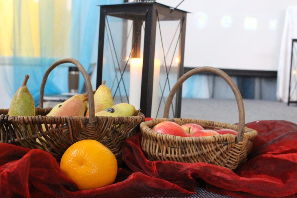 Pausenhalle auf: Körbe voller Obst und Gemüse, bunte Tücher und