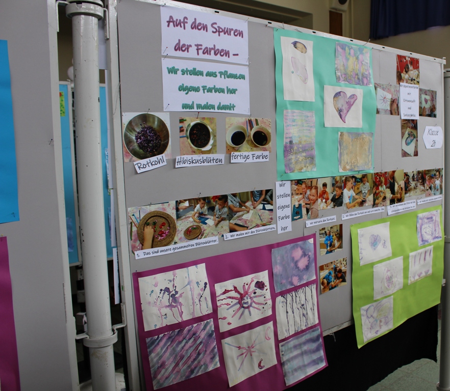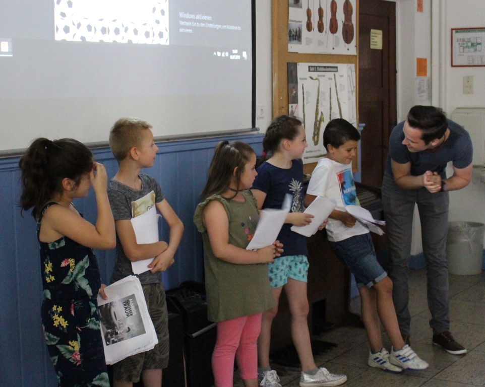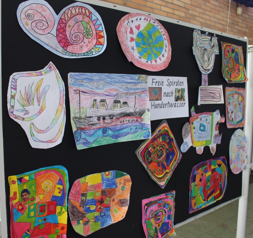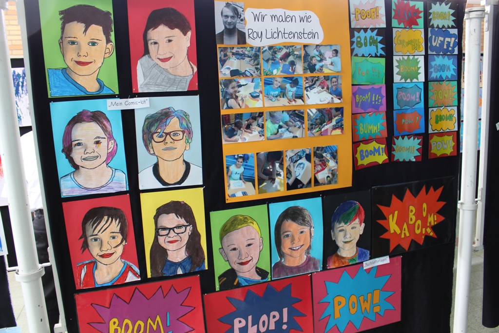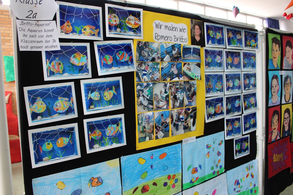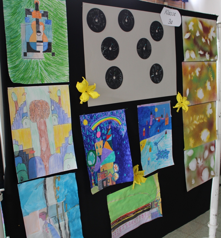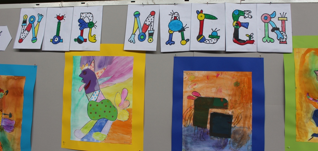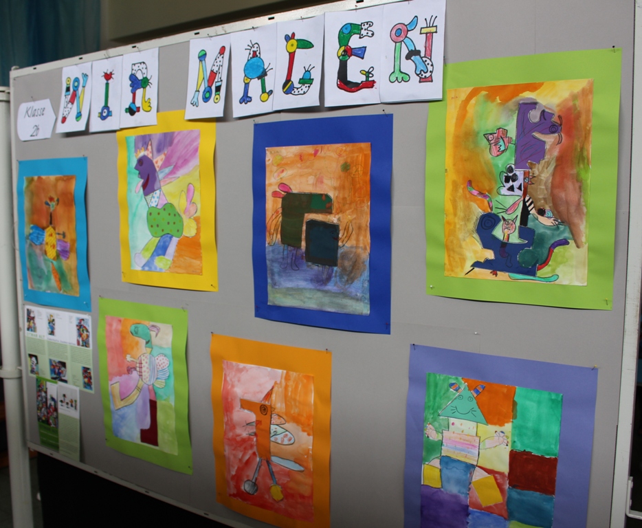 alle Kinder der Aloysiusschule mit Künstlern und verschiedenen Mal-