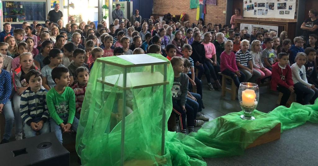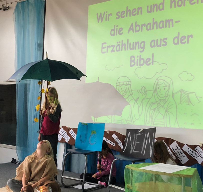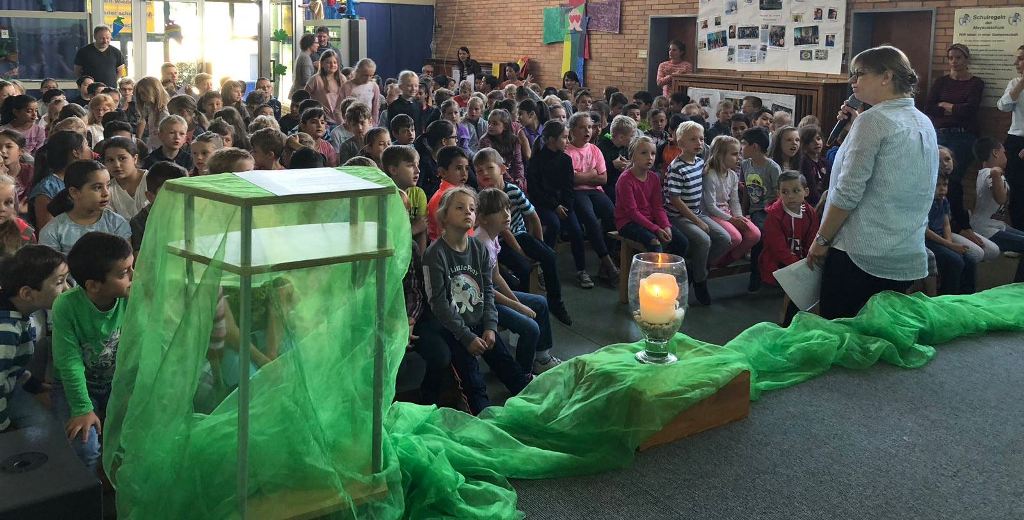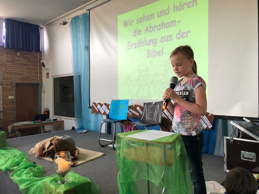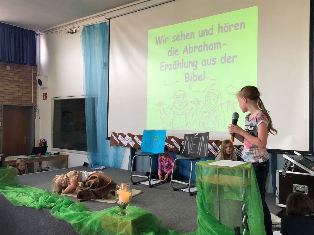 Die Kinder der Gottesdienst-AG und Frau Balzer haben einen wunderschönen Abschiedsgottesdienst in der Pausenhalle durchgeführt.