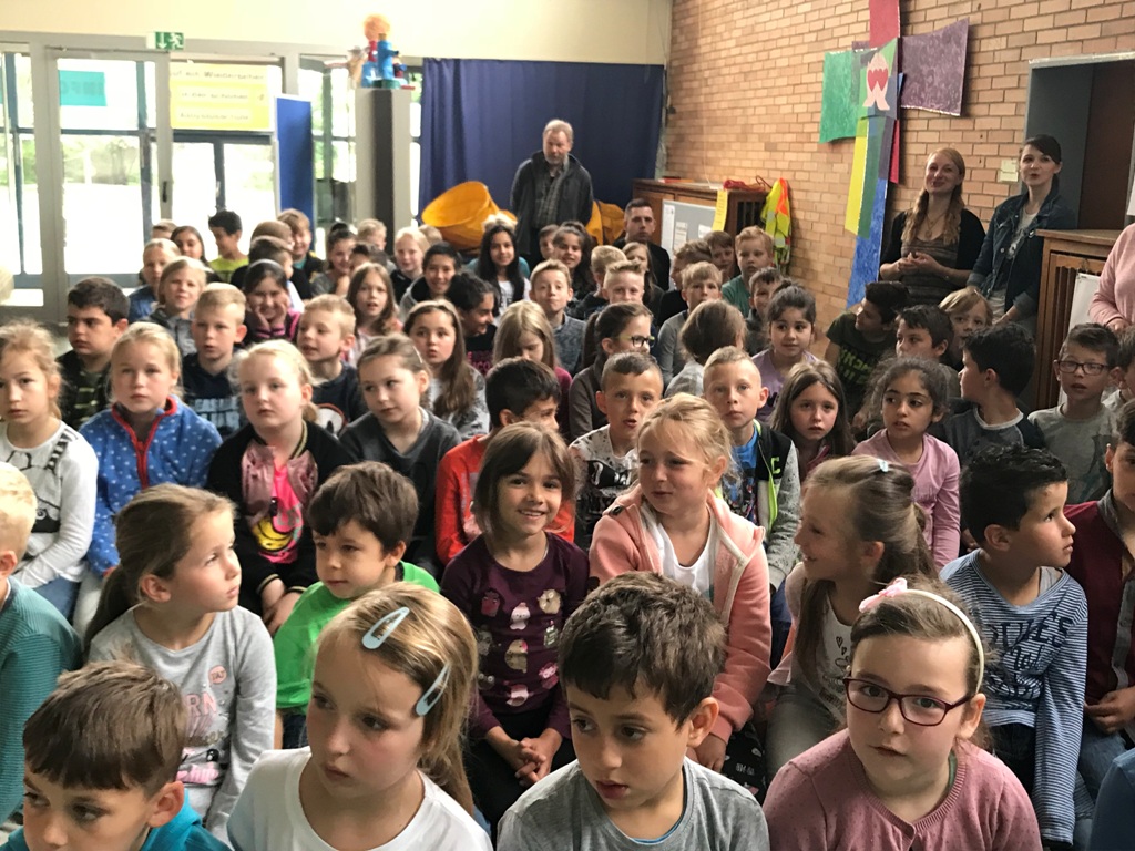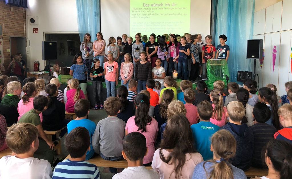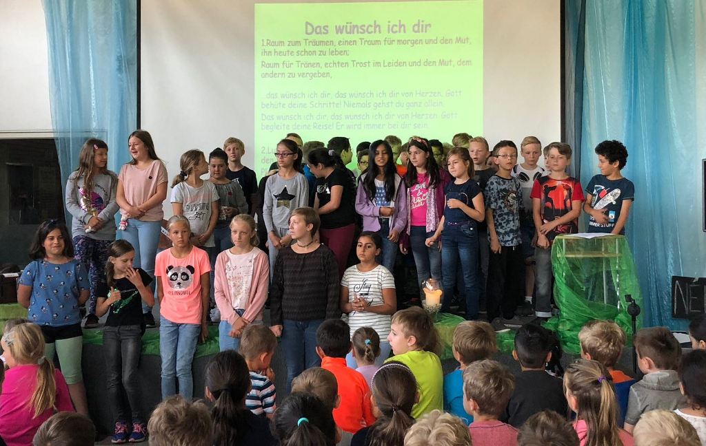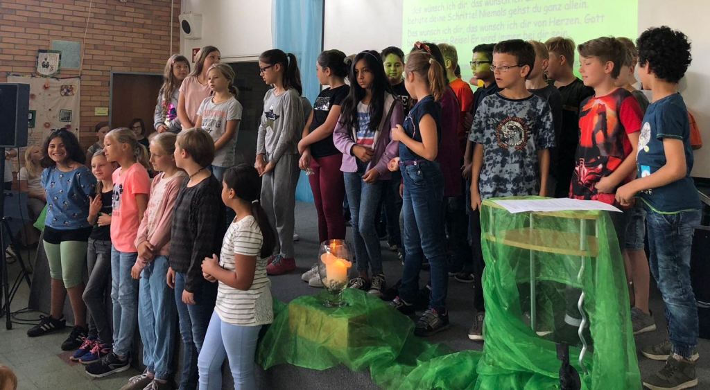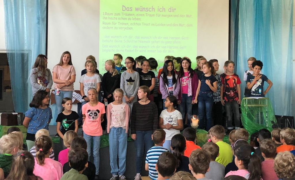 Die Kinder der Gottesdienst-AG und Frau Balzer haben einen wunderschönen Abschiedsgottesdienst in der Pausenhalle durchgeführt. Die Kinder haben wunderschön gesungen und die 4. Klassen verabschiedet.