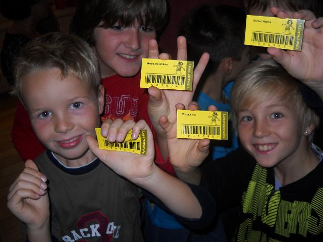 Hier seht ihr unsere neuen Büchereiausweise. Wir lassen sie lieber in der Bücherei, damit wir sie nicht verklüngeln.